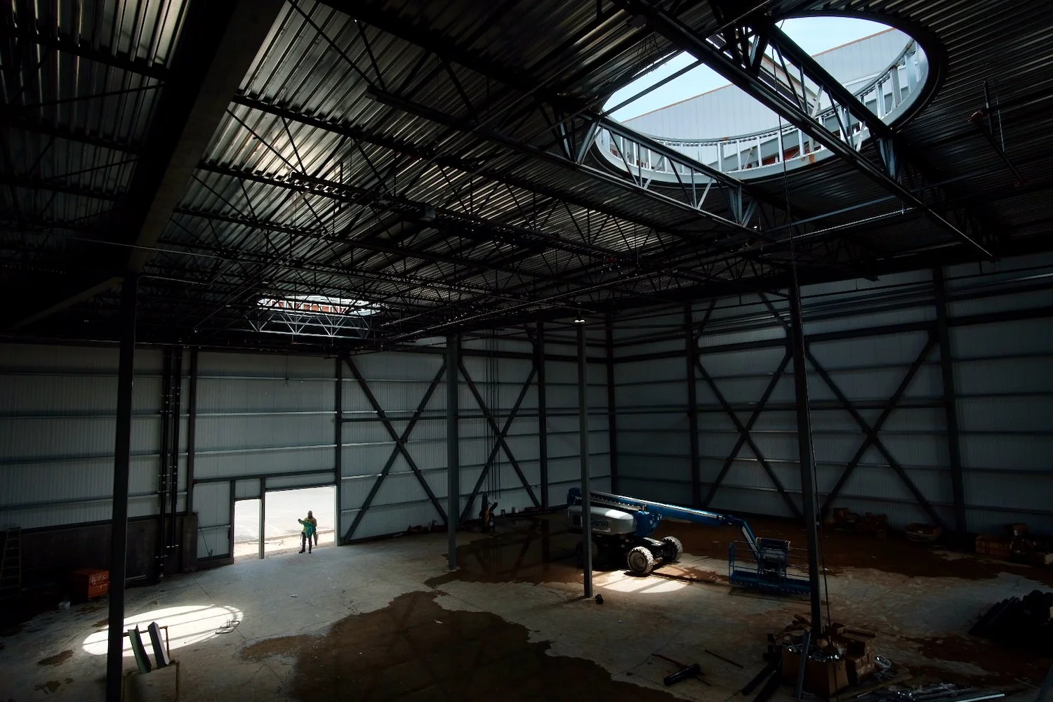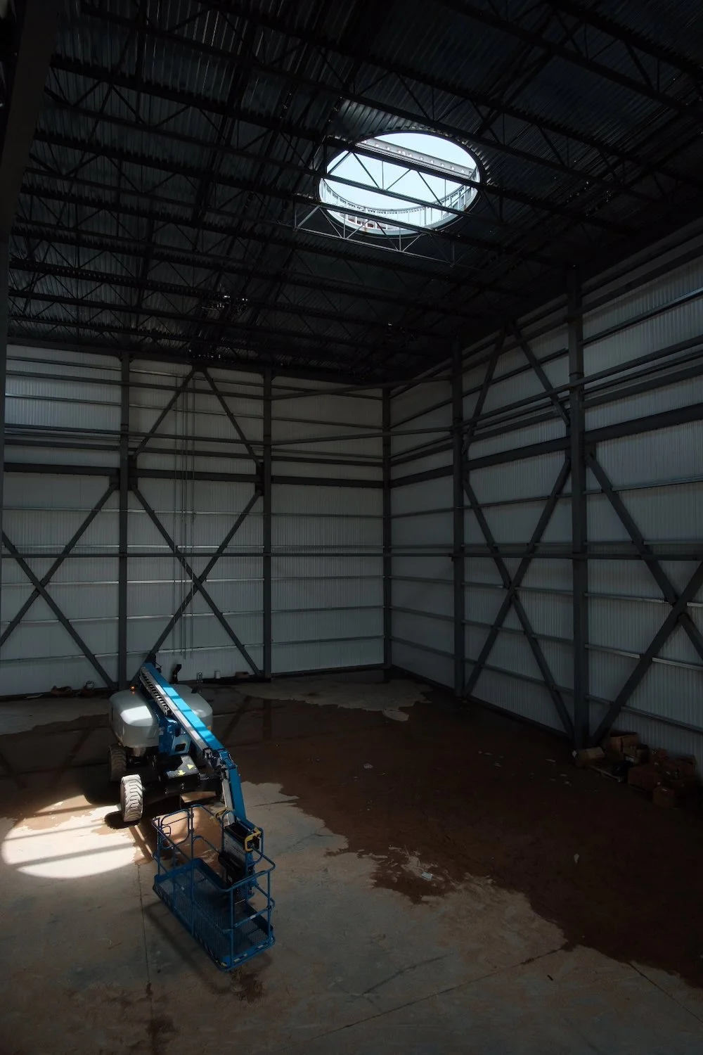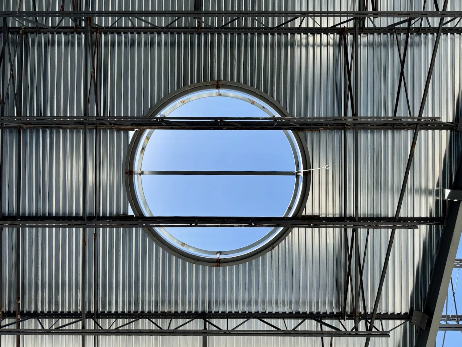 A large circular skylight marks the center of the bouldering hall—bringing daylight deep into the space and creating a dramatic focal point overhead.