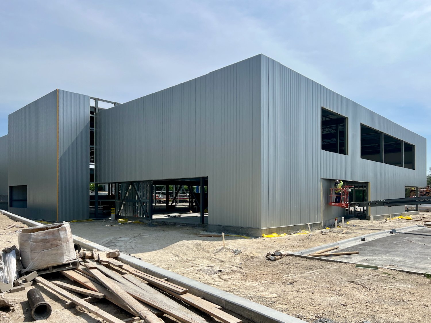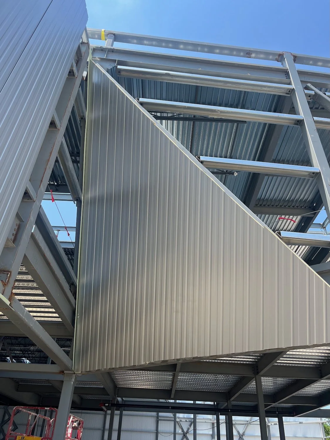 A cantilevered shade volume connects the entry to parking and frames the adjacent courtyard, transforming a simple circulation path into a social hub at the heart of the campus.